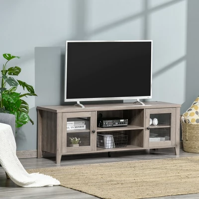 Add a stylish accent piece to your living space with this HOMCOM TV bench. The entertainment stand includes a large tabletop, two open shelves, and two side cabinets with 3-position adjustable shelves for plenty of storage space for game consoles, remotes, and more. Two cable management holes on the back of the media center keep your tabletop tidy, clean and bright. Gather around to watch your favorite shows, movies, and more with this modern and contemporary TV stand with storage.